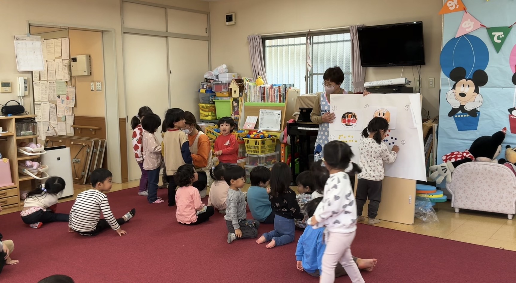 アンパンマンのノ手遊びでは「これはうれしい音かな?」「これは起こっている音かも??」とクイズ形式で聞いていきました。